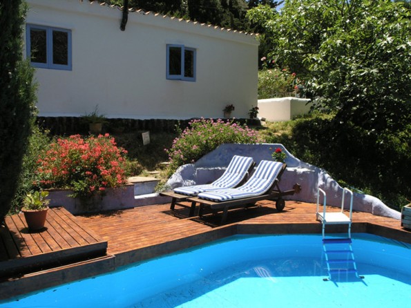 There is a flower festooned private patio with stunning mountain views. There are teak sunloungers around a decked pool, and table and chairs on the terrace outside the cottage.