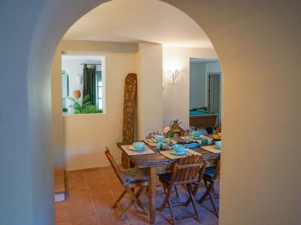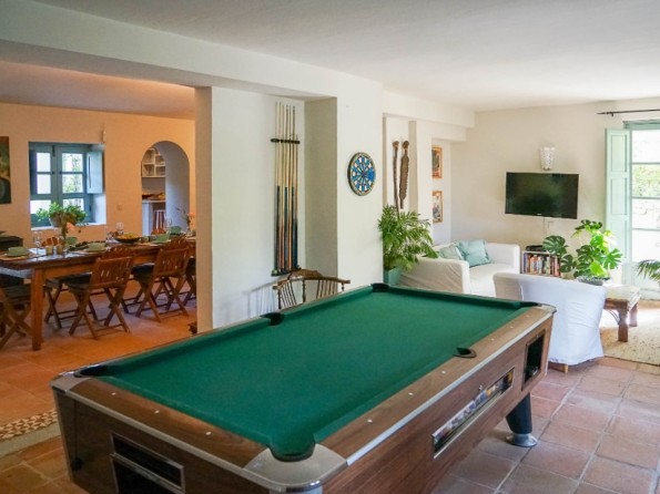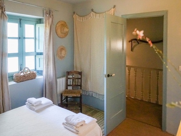 The sitting room incorporates a full size American bar pool table and opens directly onto the garden. There is both a television showing UK free view and Spanish channels, a DVD player and library and also a music speaker dock. Spanish reference books, novels and art books fill bookshelves and there is wifi throughout the house. Childrens toys fill a wardrobe and playing cards to hand. Relaxed meals take place at the marble topped kitchen table in the fully equipped kitchen or in the spacious dining room. Doors open from both rooms onto the entrance courtyard. Upstairs there are two double bedrooms, a twin bedroom and one bathroom with shower. Floors are carpeted with local sisal, the bedrooms have views over the garden and courtyard and the bathroom has views over the walled garden. All sheets and towels are pure cotton and pool towels are also provided. The farmhouse has metre thick walls to insulate it against the extremes of temperatures. It has been renovated with traditional materials of fired earth roof and floor tiles,reclaimed encaustic cement and decorative tiles in the kitchen, and travertine, white marble or granite surfaces in the kitchen and bathroom. Painted throughout in the soft olive greys of faded lime wash. A log burning stove and central heating warm the house in the winter months and there are fans in every bedroom should a heatwave strike.