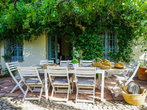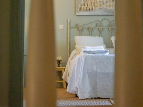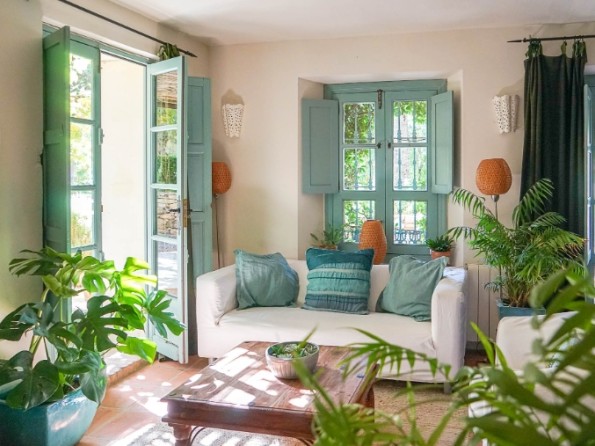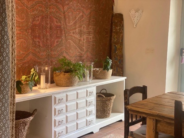 Casa Maia has a private entrance patio, courtyard garden, and dining terrace. It also enjoys exclusive use of the 11 metre swimming pool. The gated swimming pool is just a short way from the house in a completely private setting. It is surrounded by lawn and flowers, sun beds sofas, pergola and mini kitchen for comfort, convenience and beauty. The grassy play area alongside boasts swings, a toddler climbing frame, slide and badminton net. The house itself opens onto the Andalus courtyard with its ancient olive trees, majestic fig tree and fountain at its heart. Framed by a wisteria and rose clad pergola, edged by agapanthus, lavender and roses it is the perfect place to sun bathe, swing in a hammock or dine. Alternatively, retreat to the comfort and deep shade of the cushions and day beds. Stoke up the bbq and lay the table for a meal under the vine, flanked by the emblematic palm tree. Encircled by a river and divided by a stream this former walnut and apple farm still abounds with fruit trees and vegetables. Do please ask us if there are any vegetables available from our allotment.