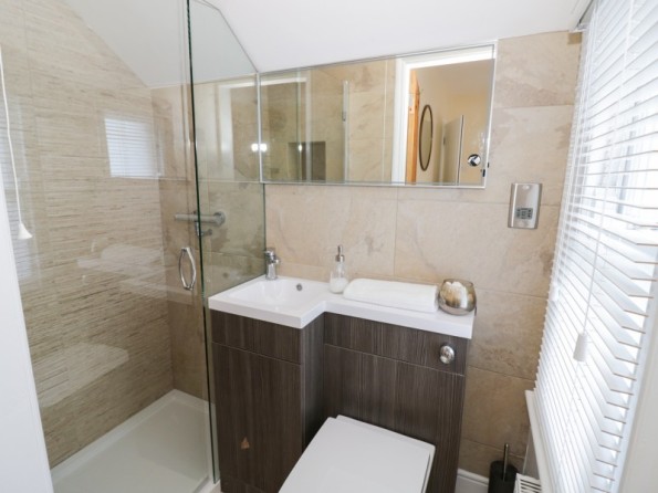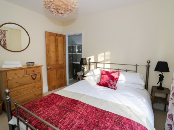 Two-storey property. Three bedrooms; 1 x king-size double with en-suite, with walk-in shower, basin and WC, 1 x double bedroom, 1 x single bedroom