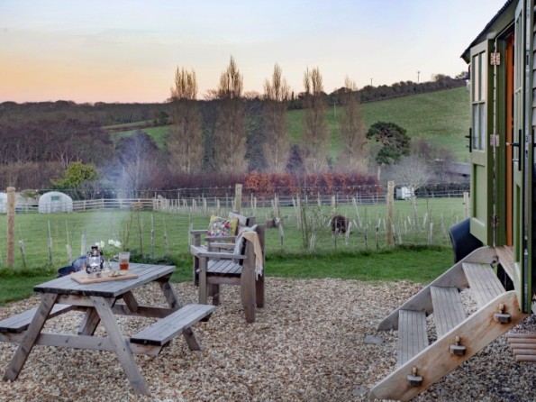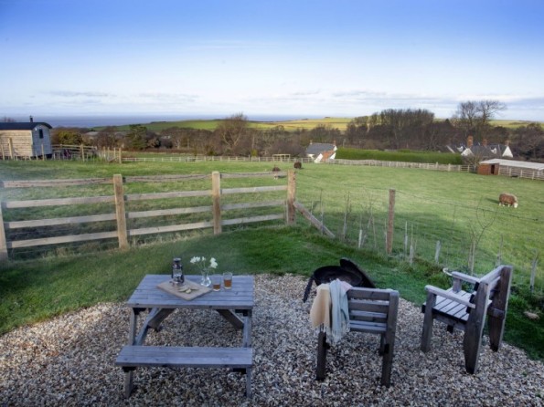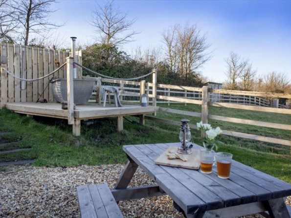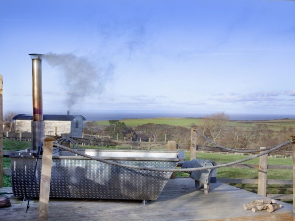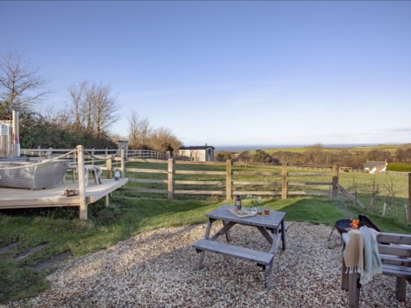 The hut has its own private garden with a seating area to the front. A Kadai fire pit, grill and bowl provides an authentic outdoor cooking experience and is also a great way to cosy up together either toasting marshmallows or enjoying a glass of bubbly. A uniquely designed private wood fired hot tub offers extraordinary countryside and sea views and is perfect for relaxation any time of the day. Logs for the hot tub are supplied