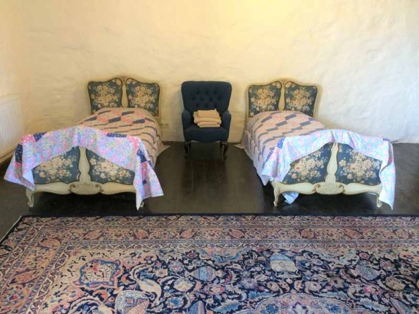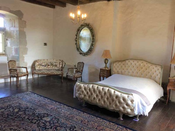The chateau can be booked on a per room, B&B basis, or as an exclusive let with use of all bedrooms. It can sleep up to 14 people in total. There are three guest suites in the chateau itself. The Princess Suite (family room) has one king size and two sets of twin beds (ie can sleep up to six people), with a luxury ensuite shower room. The Prince Suite has a double bed and a single bed (can sleep up to three people) and a luxury ensuite bath / shower room. The Petite Princess is a bedroom on the ground floor with two double beds (can sleep up to four people) with an adjacent cloakroom. In addition there is a fold up bed available for an additional person. There is a grand reception room with an ancient fireplace and antique furniture. The chateau kitchen has an Aga and farmhouse kitchen table. The former chapel on the second floor is now a bar / games room with a pool table.