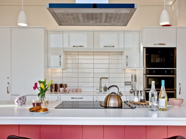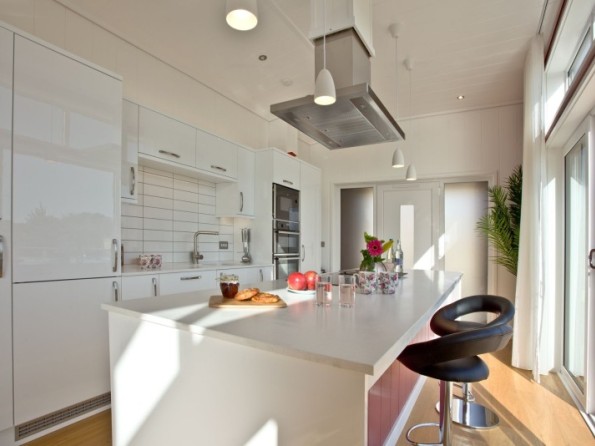 Modern gloss units with built-in electric oven with warming tray, gas hob, built-in microwave, fridge freezer, dishwasher, wine cooler, induction kettle, toaster and cafetière