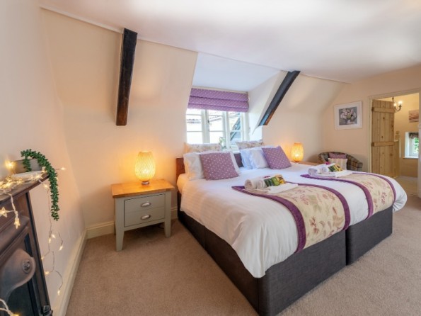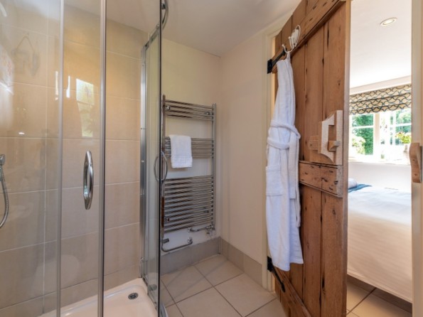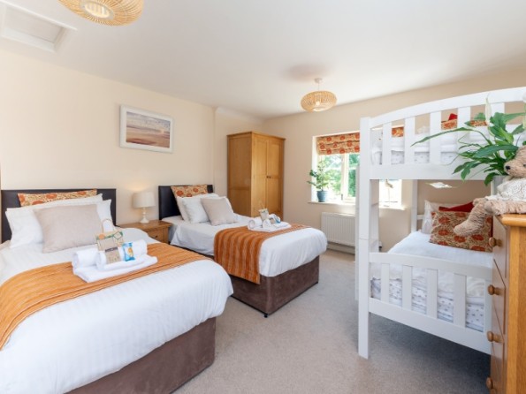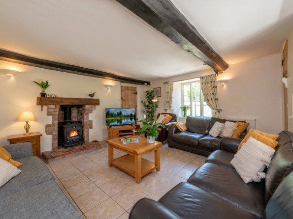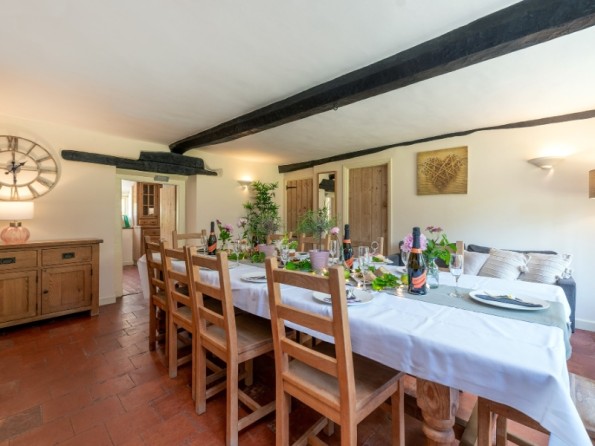 The farmhouse kitchen is furnished in a shaker style, with the original brick paved floor and pine dresser as well as a breakfast table. There is a magnificent dining room with inglenook fireplace and views of the walled garden, and the sitting room has a cosy wood burning stove, plenty of comfy leather sofas and a flat screen TV. The downstairs bedroom has an en-suite shower room, a king size bed and lovely views of the fields, and the remaining four bedrooms (one en-suite) are located on the first floor. The farmhouse also has a games room with a pool table, a play room with toys and bean bags, a utility room and a coat/boot room.