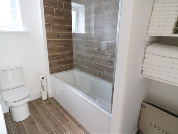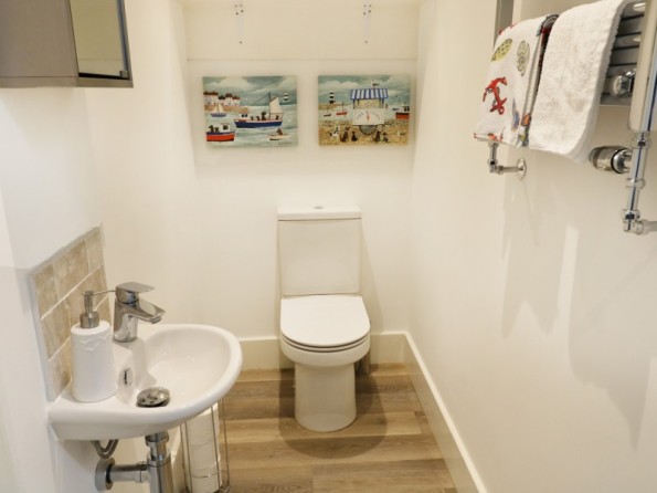 Over two floors. Two bedrooms: 1 x first floor king-size double with TV, 1 x ground floor double. Bathroom with bath, shower over, basin and WC. Ground floor cloakroom with basin and WC (disabled access). Open-plan living room with sitting, dining and kitchen area. Entrance hallway.