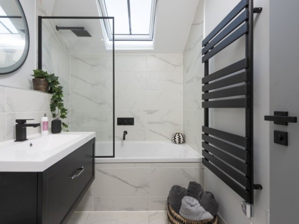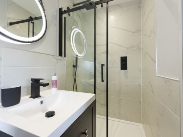 En-suite to Bedroom Three features a walk-in shower with rain head attachment, hand basin and cabinet, heated towel rail and electric mirror