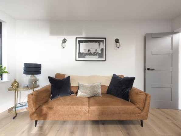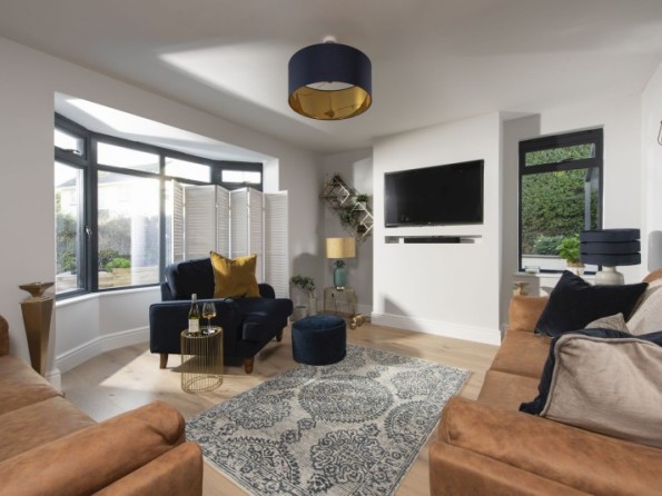 The separate sitting room features a large bay window, two leather sofas and an upholstered velvet armchair and matching footstool. The room's entertainment system includes a large Smart flat screen TV with soundbar and bluetooth speaker. Additional furnishings include occasional tables and lamps as well as a shutter screen