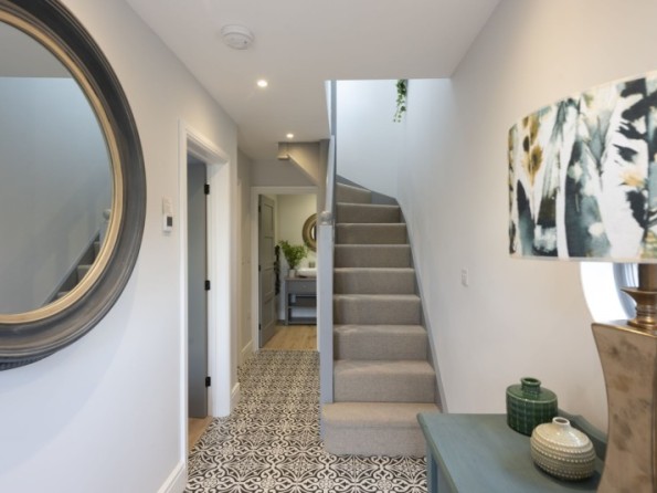 The entrance hall to the home features decorative floor tiles and a console table with lamp. A staircase leads from here up to the property's first floor