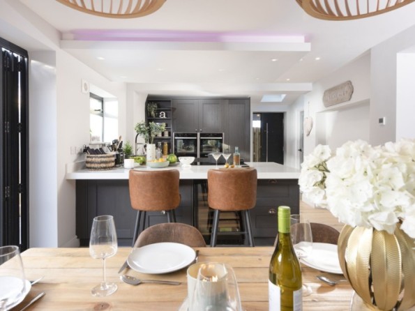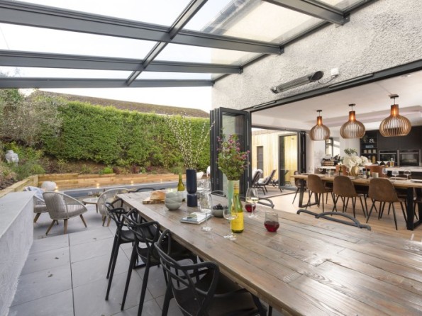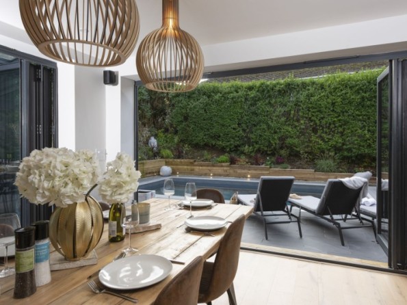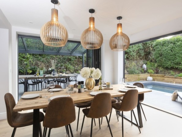 A fantastic space with double aspect bifold doors leading out to the pool terrace and outdoor dining space. Furnished with an industrial style timber-topped dining table and eight dining chairs