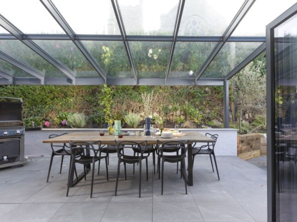A fabulous outside dining area with glass awning can be found to the side of the house and is accessed from the open plan living room. Ideal for alfresco bbq's and fresh air suppers, an outdoor heater keeps things warm and comfortable and the space is furnished with a timber dining table, eight chairs and a gas Weber Spirit bbq