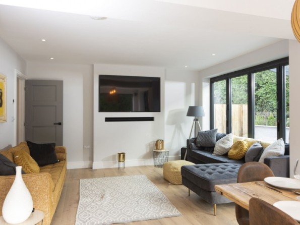 Open plan with the kitchen and dining room this spacious snug is furnished with a grey upholstered velvet L-shaped sofa, a second sofa, large flat screen Smart tv and soundbar, fabric pouffe, occasional tables and floor lamp