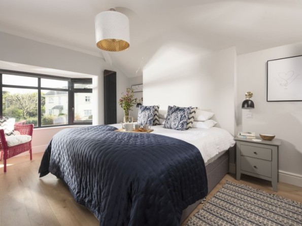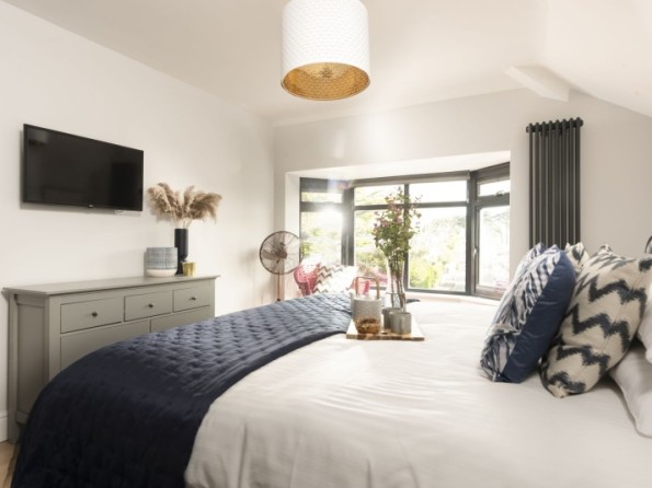 This beautiful en-suite bedroom features a large bay window, a hot pink wicker armchair for a pop of colour, and a luxury super king size bed with fluffy pillows and high-quality bedding. A smart flat screen TV hangs on the wall with a chest of drawers and freestanding wardrobe providing storage. Additional furnishings include a floor fan, bedside tables and reading lamps