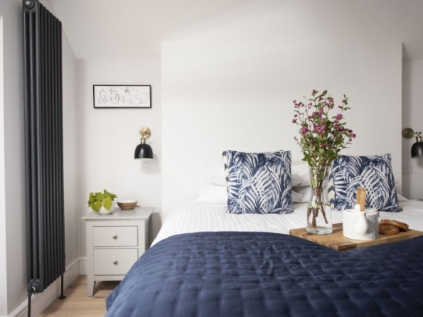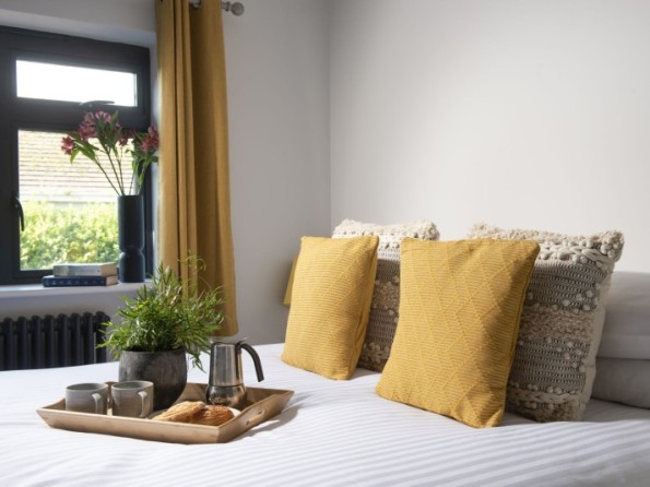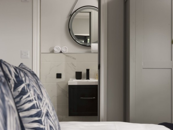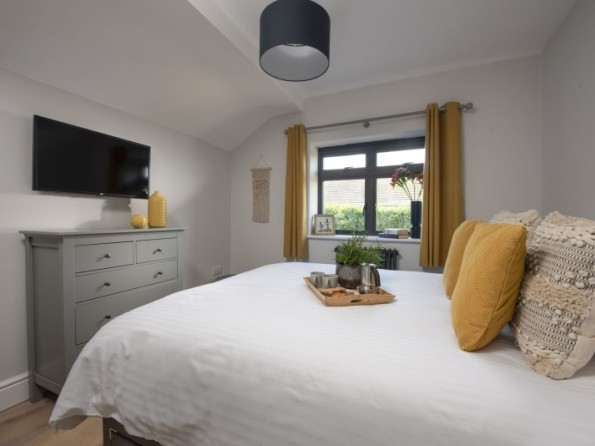 Elegantly styled, this en-suite room is furnished with a high quality, double bed and crisp cotton linen, with a large chest of drawers and freestanding wardrobe providing storage. The room also features a wall-mounted Smart television and two bedside tables with lamps