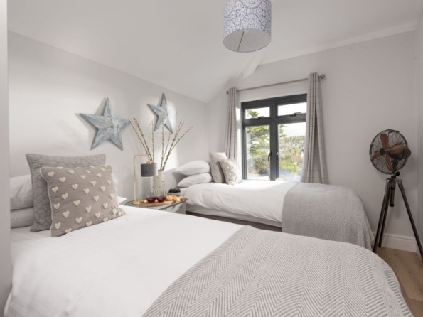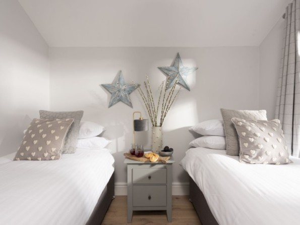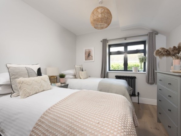 This stunning room features two single beds, a pedestal table with reading lamp, and a large window that floods the room with natural light. A floor fan is ideal for keeping guests cool on warmer evenings, with a built-in wardrobe and chest of drawers providing storage