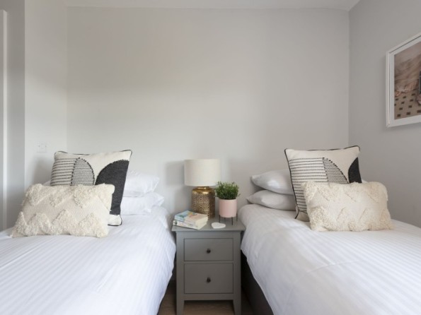 This bright, light-filled room features twin beds with crisp white linen and neutral greys for a calming ambience. A chest of drawers, freestanding wardrobe and a pedestal table provide storage