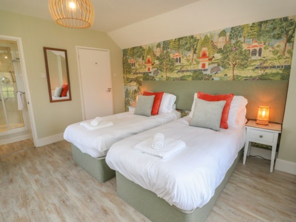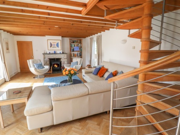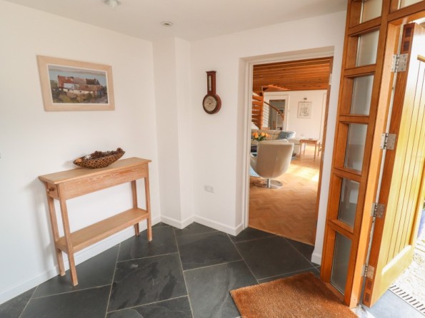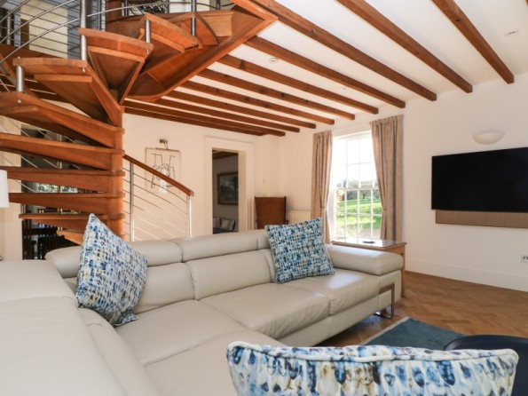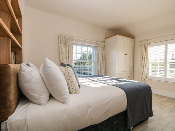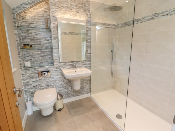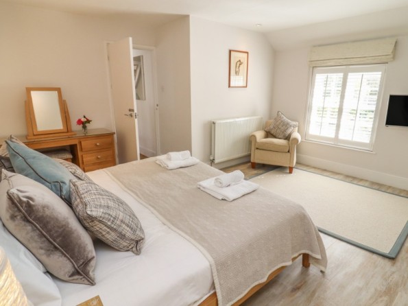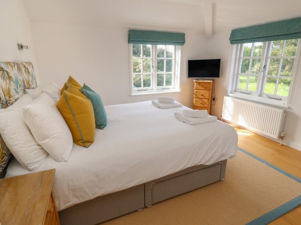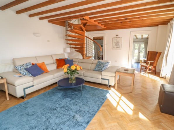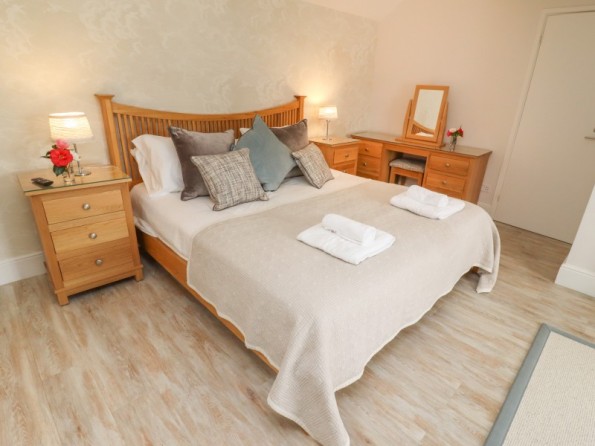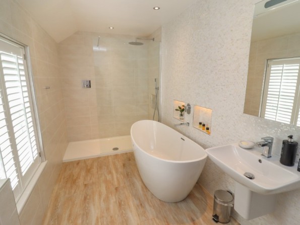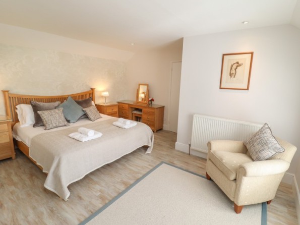Four bedrooms: 1 x super-king size double (can be twin on request) with en-suite shower-room, 1 x king size double with TV, and en-suite shower room, 1 x super king size double with TV, 1 x king-size. Bathroom with bath, shower cubicle, basin and WC. Sitting room with woodburning stove and smart TV. Kitchen with dining area. Conservatory. Utility Room. Cloakroom