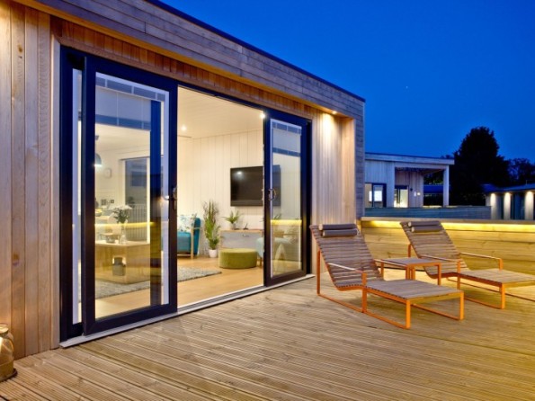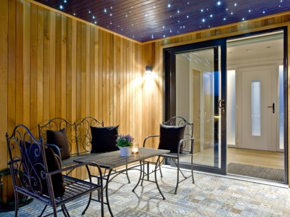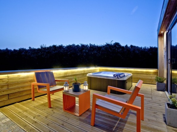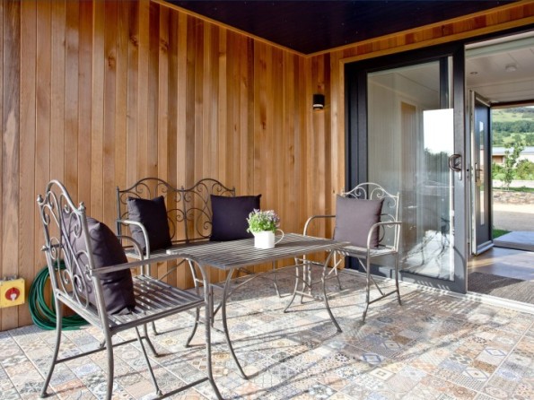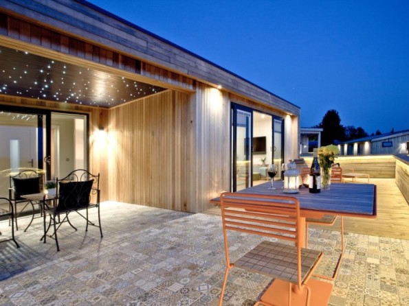 - Decked terrace at the back of the lodge with LED lighting along the edge