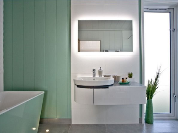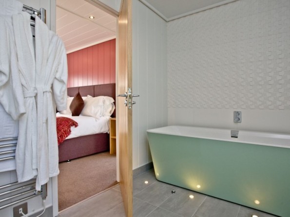- Walk in rainfall shower and freestanding bath with LED spotlights to the floor, heated towel rail, wash basin with shaver point, WC and mirror with motion controlled lighting