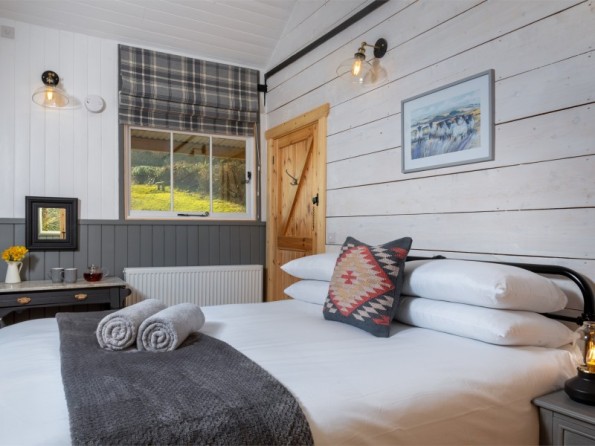 2 bedrooms 1 king size, 1 twin zip and link (which can be made into a king size on request). 2 en suite shower rooms, 1 separate WC in the boot room. Electric cooker with ceramic hob, microwave, dishwasher and fridge freezer. Separate boot room with washing machine (this is found down a few steps). Smart TV. Wood burning effect gas fire. Wi Fi included. Mobile signal variable but 4G available. High chair available. Access from parking area is via steps with handrails into the hall. Level access is available for those with limited mobility from road level please use the gate to the right of the feature front door (not in use). Decked veranda with fire pit within the open front gardens . Enclosed paddock for dogs adjacent and is across a narrow lane that passes by the property. Fishing available on discussion with owner. Off road parking for several cars. Pub across the road, nearest shop 3 miles (Abergavenny).