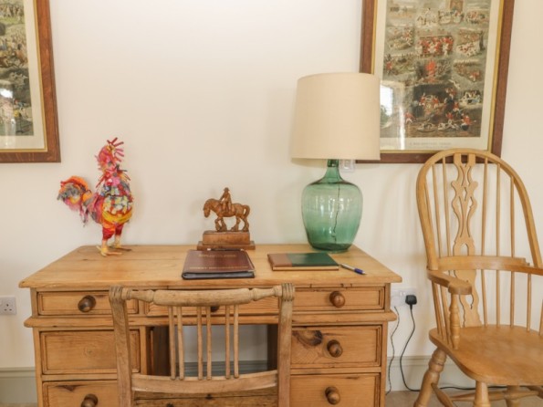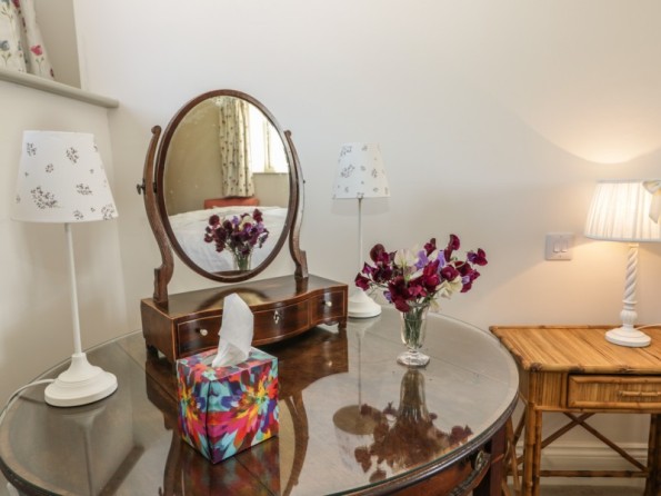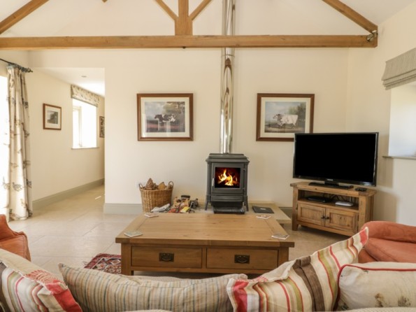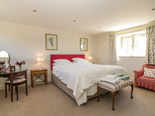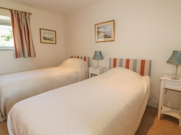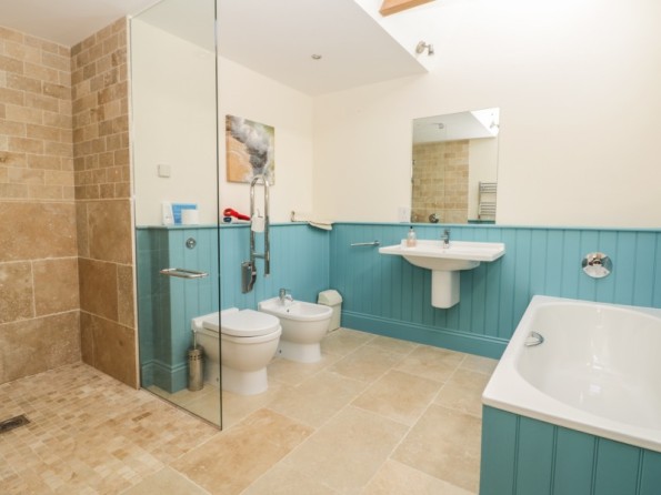 All ground floor. Two bedrooms: 1 x super king-size double with en-suite bath, separate shower, basin and WC, 1 x twin (zip/link, can be king-size double on request) with en-suite shower, basin and WC. Open-plan kitchen, dining and sitting area with woodburning stove.