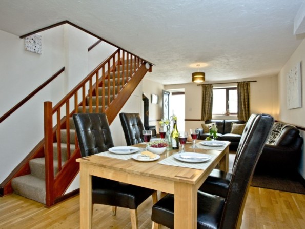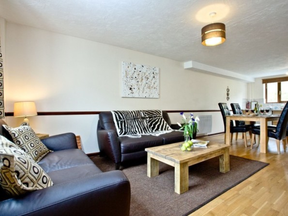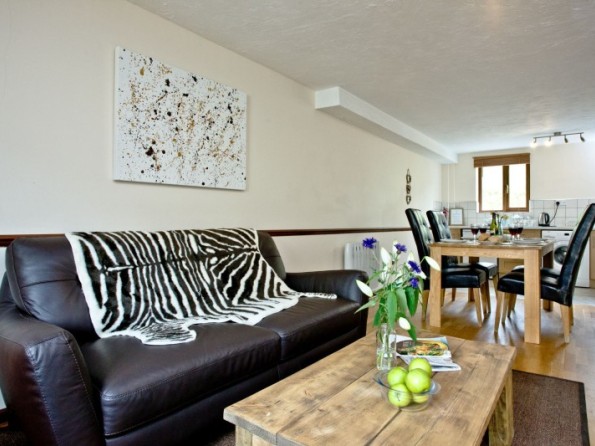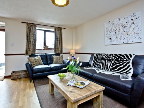 Two leather sofas seating six, wood burning stove, TV with Freeview, DVD player and Bluetooth music system