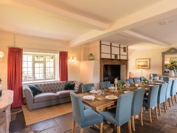 The house has seven double rooms and a triple and all of the beds are zip and link beds meaning they can be rearranged for two singles or one double bed. Some of the rooms have spectacular views across the surrounding land and have a light and spacious interior. The kitchen provides all of the necessities and is equipped to cater to large parties with an American style fridge-freezer and two dishwashers in addition to a microwave and range cooker plus oven. The house has five bathrooms and a downstairs WC and the utility room has a washing machine and a dryer. The dining room, complete with a log burner fire, sits up to seventeen people and there’s a drinks room adjacent to the dining room with a spare fridge-freezer and glassware.