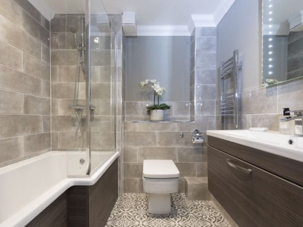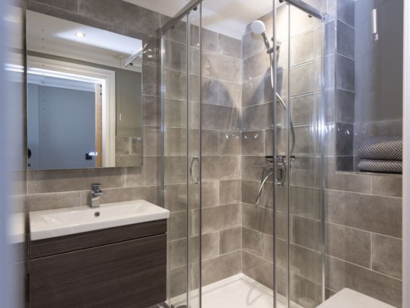 The en suite to the master bedroom, this contemporary bathroom has a walk-in corner shower, W/C, lit mirror, heated towel rail, basin with mixer tap and cabinet.