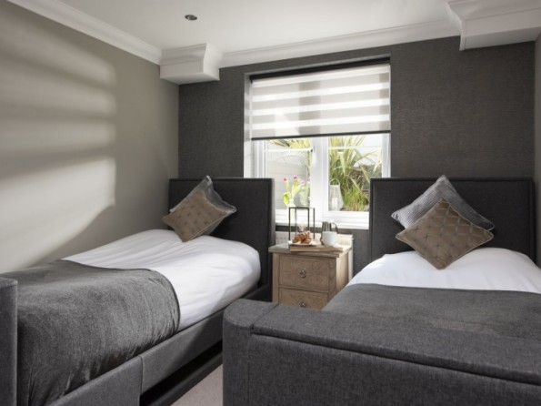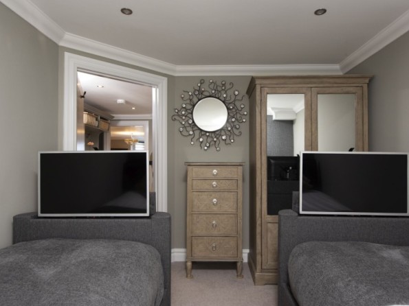 This bedroom features twin TV beds with luxury Relyon mattresses, bedside tables and lamps, a mirror, chest of drawers and a freestanding wardrobe with mirror doors.