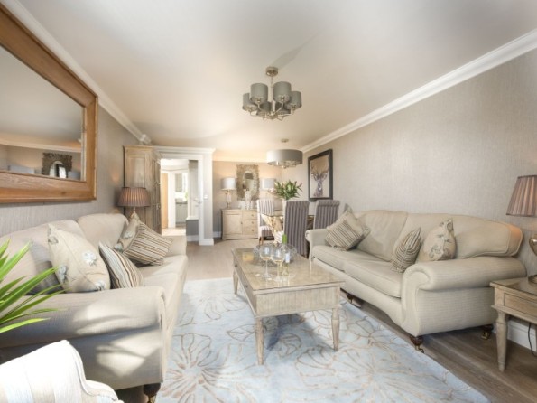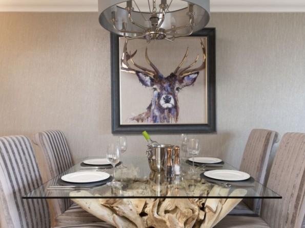 Open-plan with the living area this beautiful room features a gorgeous bespoke glass-topped dining table with four upholstered dining chairs and a sideboard.