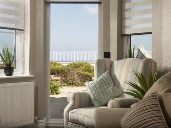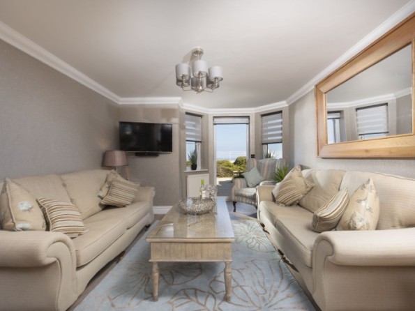 Doors open from this room out to the front terrace which has fantastic sea views.