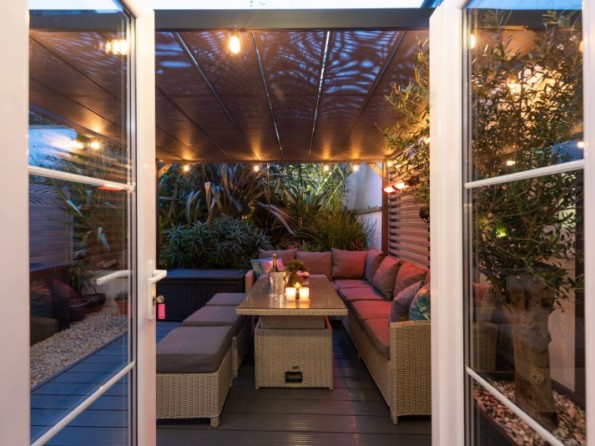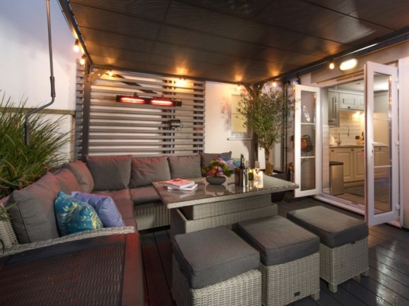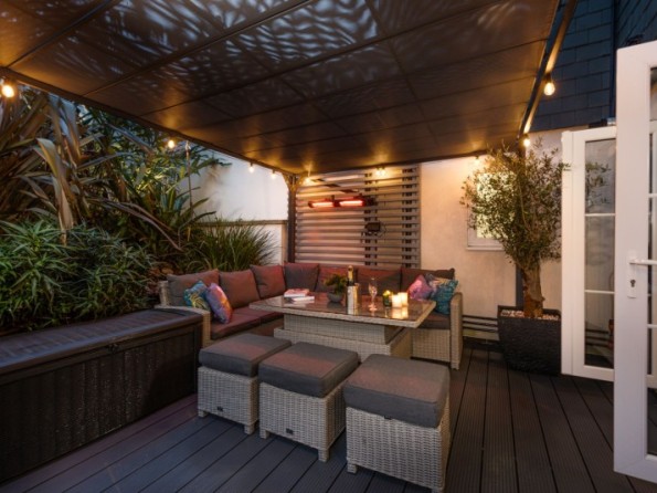 Accessed through the kitchen this large private courtyard garden is completely enclosed and features lush planting that surrounds an outdoor lounge suite with L-shaped sofa, three footstools, a dining table and a large wall-mounted slatted commercial outdoor heater.