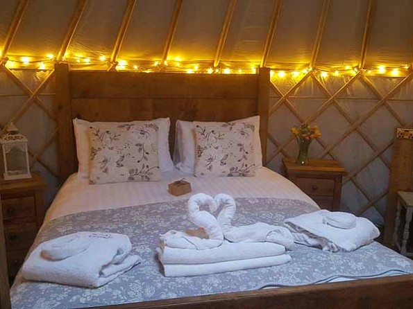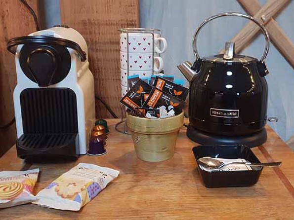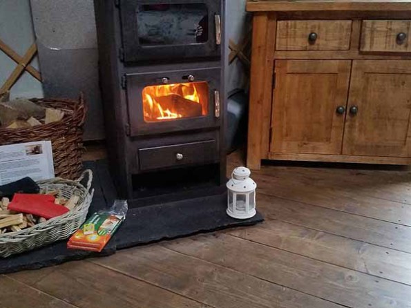 The yurt can sleep up to five people in one king size bed and three singles, all of which will be made up with feather down duvets and crisp white linens. Fluffy towels and bathrobes add an air of decadence, fairy lights create atmosphere and the wood burning stove oven is not only essential for cosiness but also for cooking pizzas, jacket potatoes and sausages. A kettle and Nespresso coffee machine are provided, as is a USB charging point, and the wash room facilities are 40 metres away.