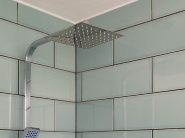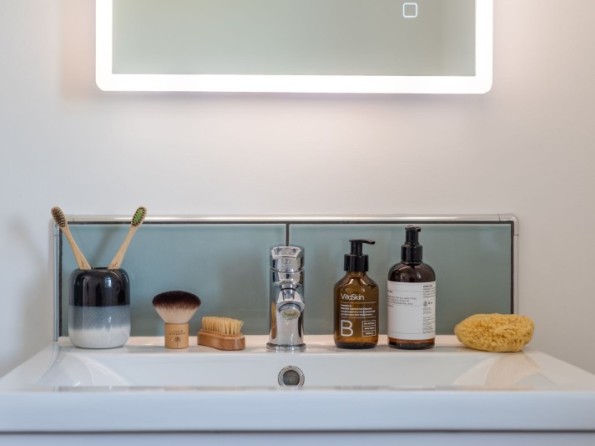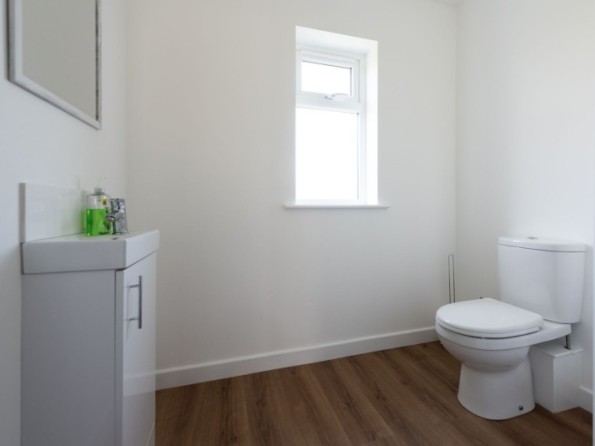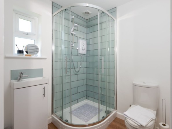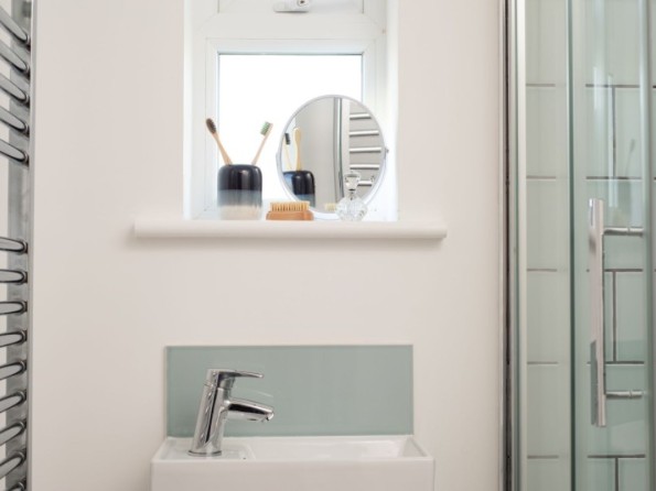 Shower, hand basin, WC, heated towel rail, mirror and cabinet