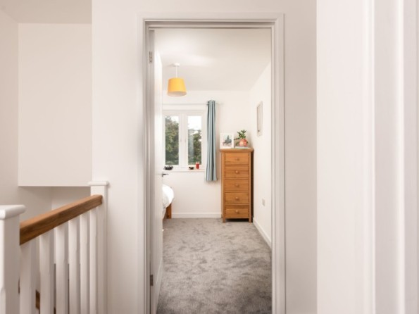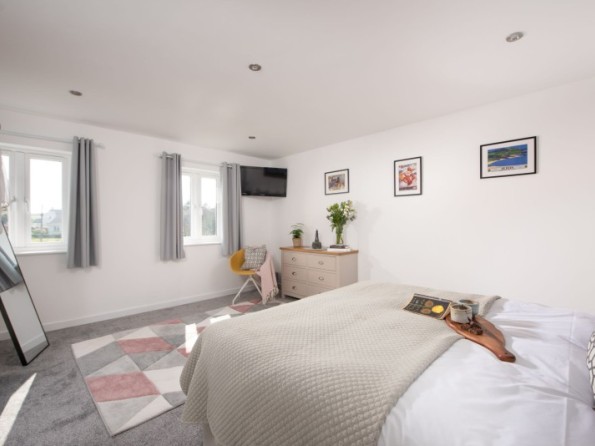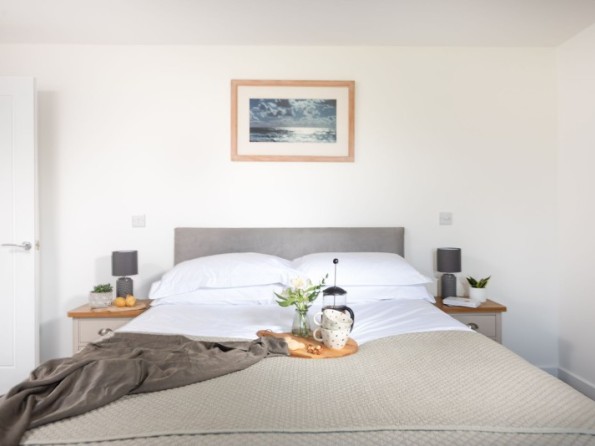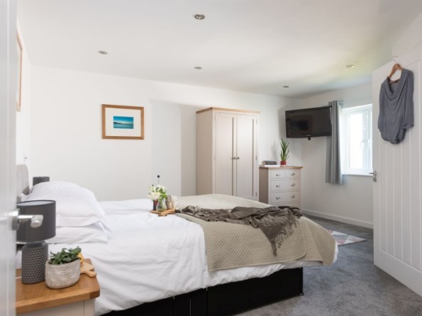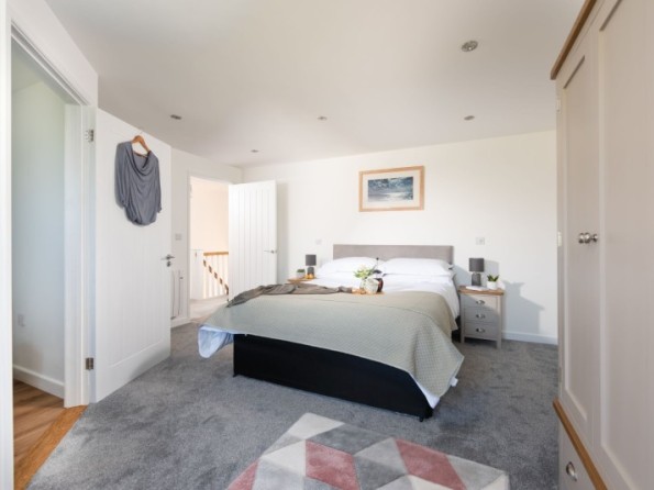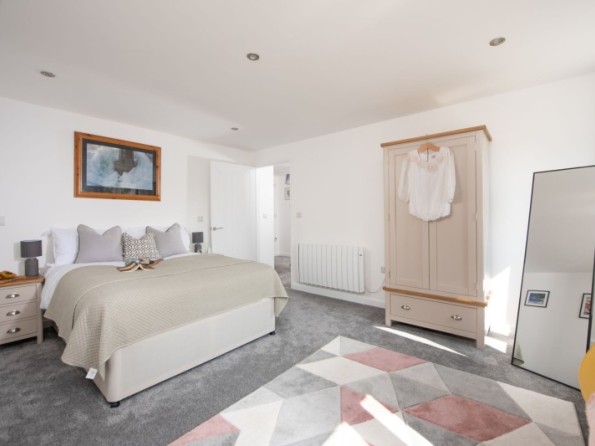 Located on the first floor the main bedroom has its own en-suite shower room and is furnished with a king size bed, bedside tables and lamps, mirror, chest of drawers and a freestanding wardrobe