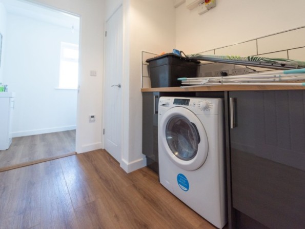 Off the kitchen housing an iron / ironing board, washing machine and vacuum cleaner