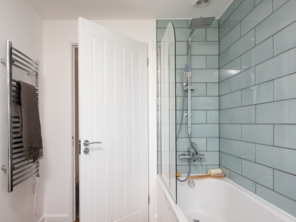 Bath with shower over, hand basin, heated towel rail, WC, hairdryer and mirror