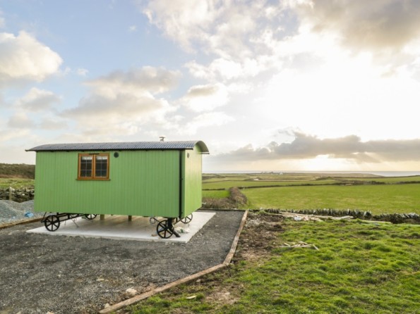 Fabulous shepherd's hut situated near the town of Holyhead on the Isle of Anglesey. Studio accommodation. Decking. Panoramic views.