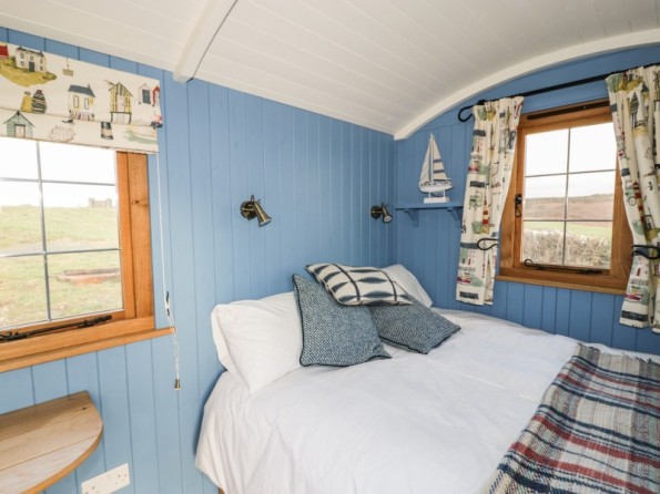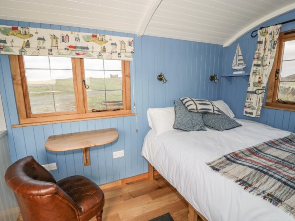 Cysgod Y Bugail is a shepherd's hut set on the outskirts of Holyhead on the Isle of Anglesey. It offers studio accommodation with a double bed as well as a shower room, the property can sleep two people. The interior also comes with an open-plan living area comprising of a kitchen and a sitting/dining area with a woodburning stove. To the outside there is off road parking for two cars and a decked balcony with furniture. Cysgod Y Bugail is a quirky, charming cottage in a fabulous countryside location, perfect for exploring Anglesey.