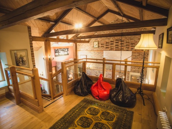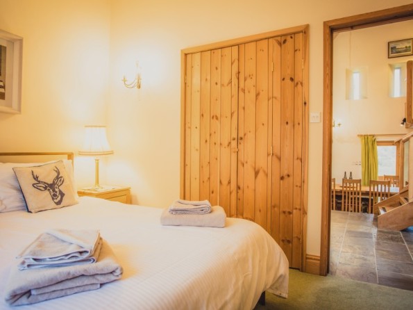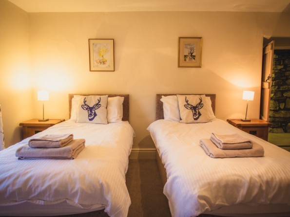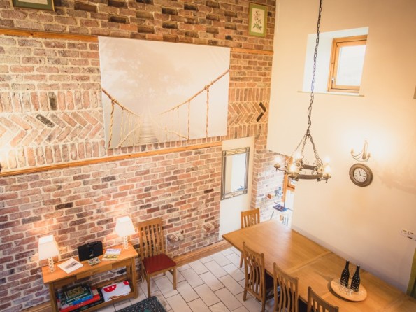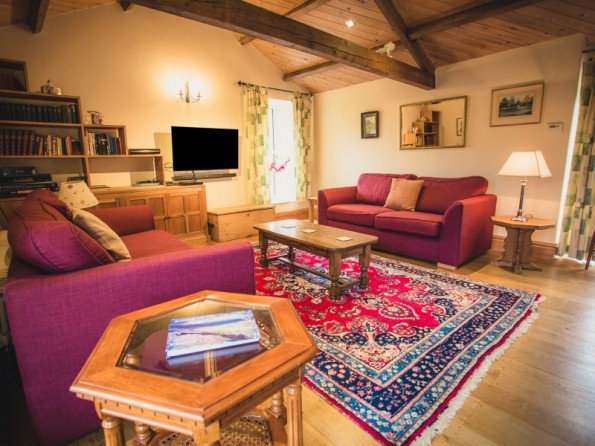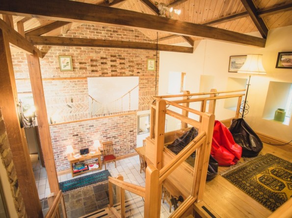 request) with two extra single beds, 1 with en suite bathroom shower over bath, 1 x twin room, a family bathroom with bath, separate shower, basin and WC, Ground floor basin and WC. Open plan kitchen, dining area (seats 14) and galleried sitting area. Utility. Ground floor sitting room (seats 8) with woodburning stove. Mezzanine area with table football. First floor sitting room (seats 6) with two sofas and woodburning stove.