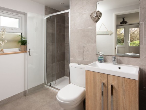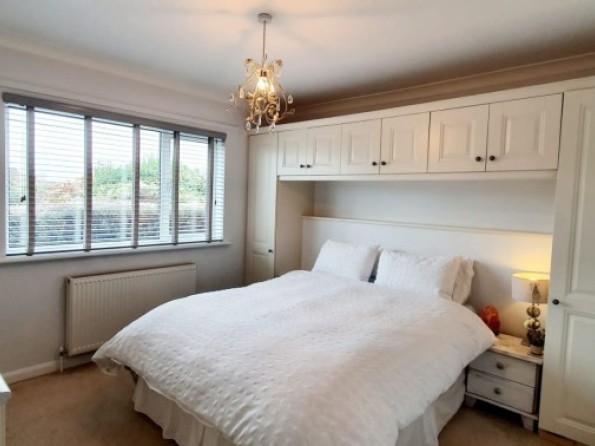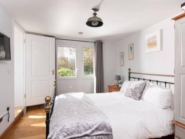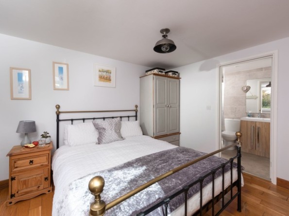 Accessed from the conservatory this lovely ensuite bedroom has its own modern shower room and is furnished with a king size bed, a bedside cabinet, Smart TV and a freestanding wardrobe. It has a doors which leads to the front of the property with access to the parking area