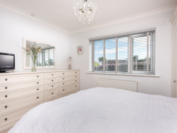 This bright and comfortable bedroom sits off the entrance hall and is furnished with a king size bed, bedside lamps, a bedside table, a TV with a CD player and built-in wardrobes