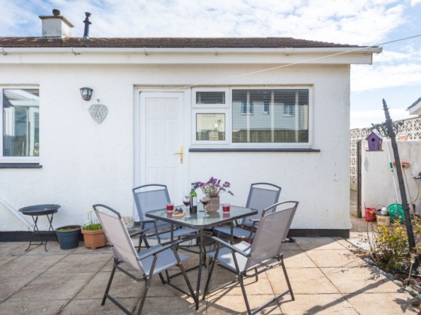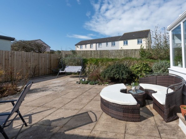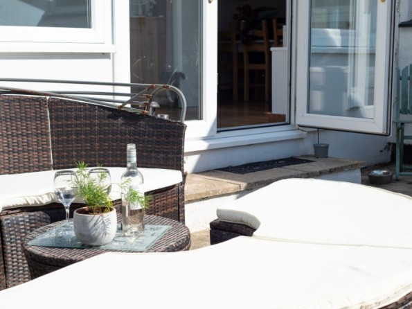 The private garden to the back of the home features a paved patio with a rattan lounge suite, table and chairs, deck chairs and sun loungers. Mature plants and shrubs border the area which is enclosed and perfect for guests who have dogs with them