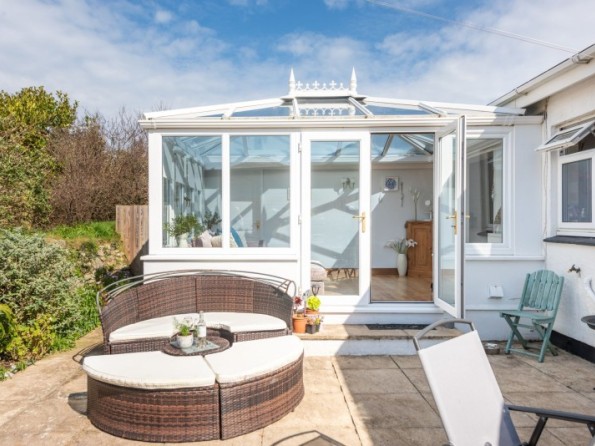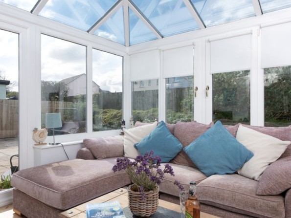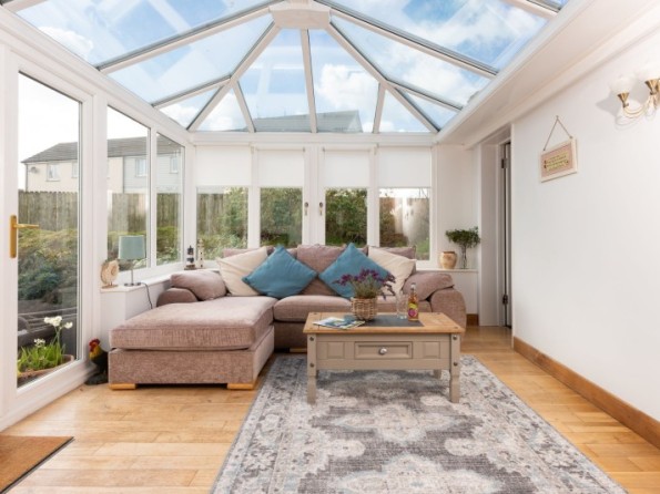 Leading from the dining area the spacious conservatory is a wonderful place to spend time relaxing with a good book or chatting with the family. Furnished with a large corner sofa, TV and cabinet as well as other occasional furniture items. It has French doors that open out to the garden.