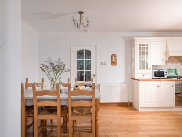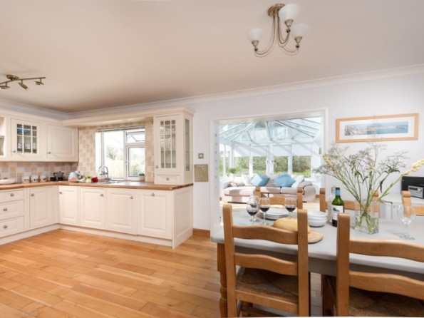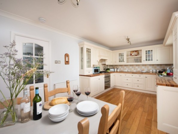 Off the entrance hall, the large kitchen features a traditional design with plenty of storage as well as oak worktops. A range of appliances are provided including a five-burner gas hob and double electric oven, microwave, kettle and toaster, fridge, dishwasher and Nespresso coffee machine, washing machine, blender / mixer, cafetiere, iron / ironing board and vacuum cleaner