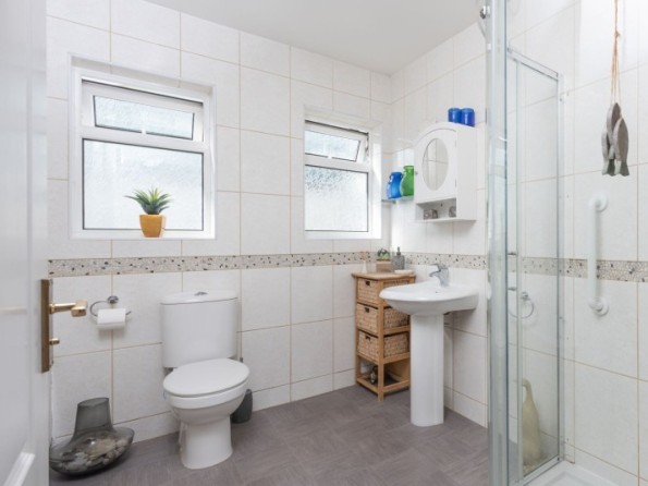 En Suite to Bedroom Three with shower cubicle, heated towel rail, wash basin with cupboard below, separate built in cupboard/dressing table with mirror above.