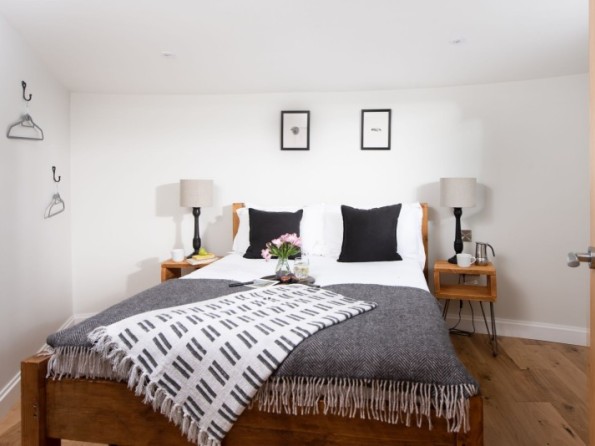 The separate second bedroom features a hand made solid wood double bed, two bedside pedestal tables and lamps as well as wall hooks for hanging clothes