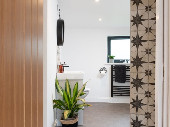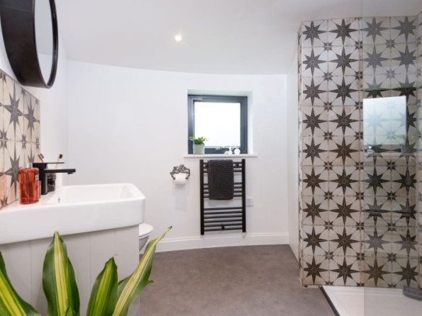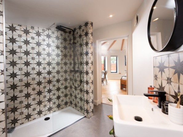 Gorgeous bathroom with feature tiles and large walk-in shower with rain head and handheld attachment, WC, heated towel rail and wash basin