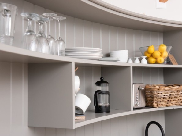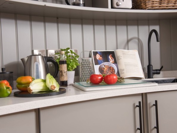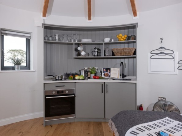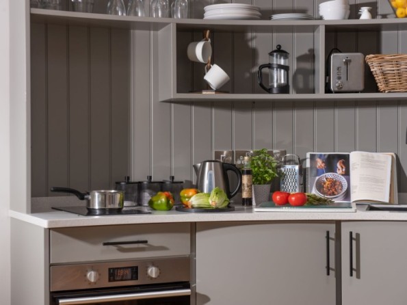 The modern kitchenette features grey units with black accents and has an induction hob, oven, fridge with freezer compartment, kettle and cafetiere as well as a selection of glasses, crockery, cookware and utensils