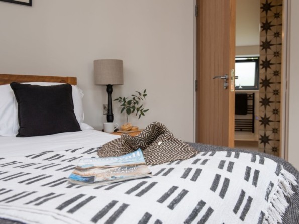 Inside you’ll discover an open plan space with a contemporary colour scheme of black and greys, where a gorgeous kitchen, dining area and double bed sit beneath a large port hole skylight. A second separate bedroom with full-size double bed creates that all important private space, and there’s a beautiful, light-flooded bathroom with signature wall tiles and a large walk-in shower cubicle for de-sanding in after a day at the beach.