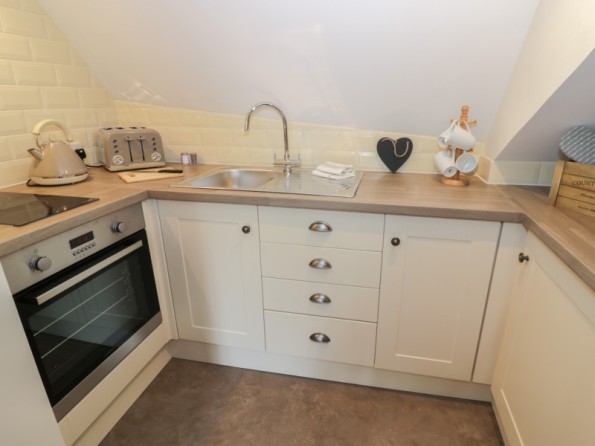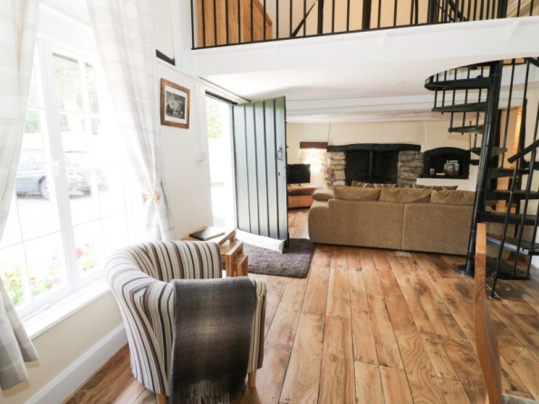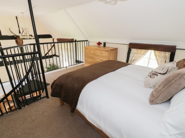 One mezzanine king-size double bedroom. Shower room with shower, basin, shaver/ toothbrush charger and WC. Kitchen. Sitting room with dining area and woodburning stove.